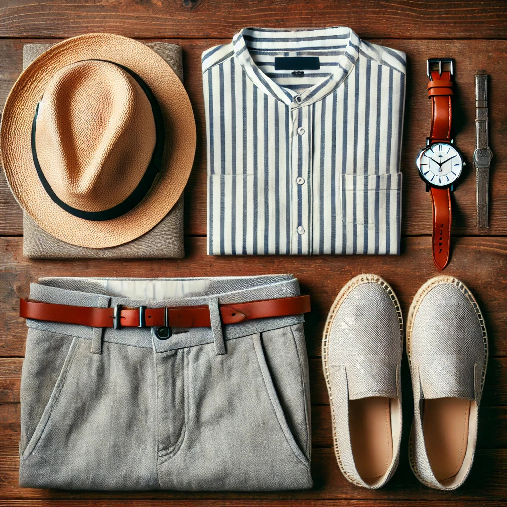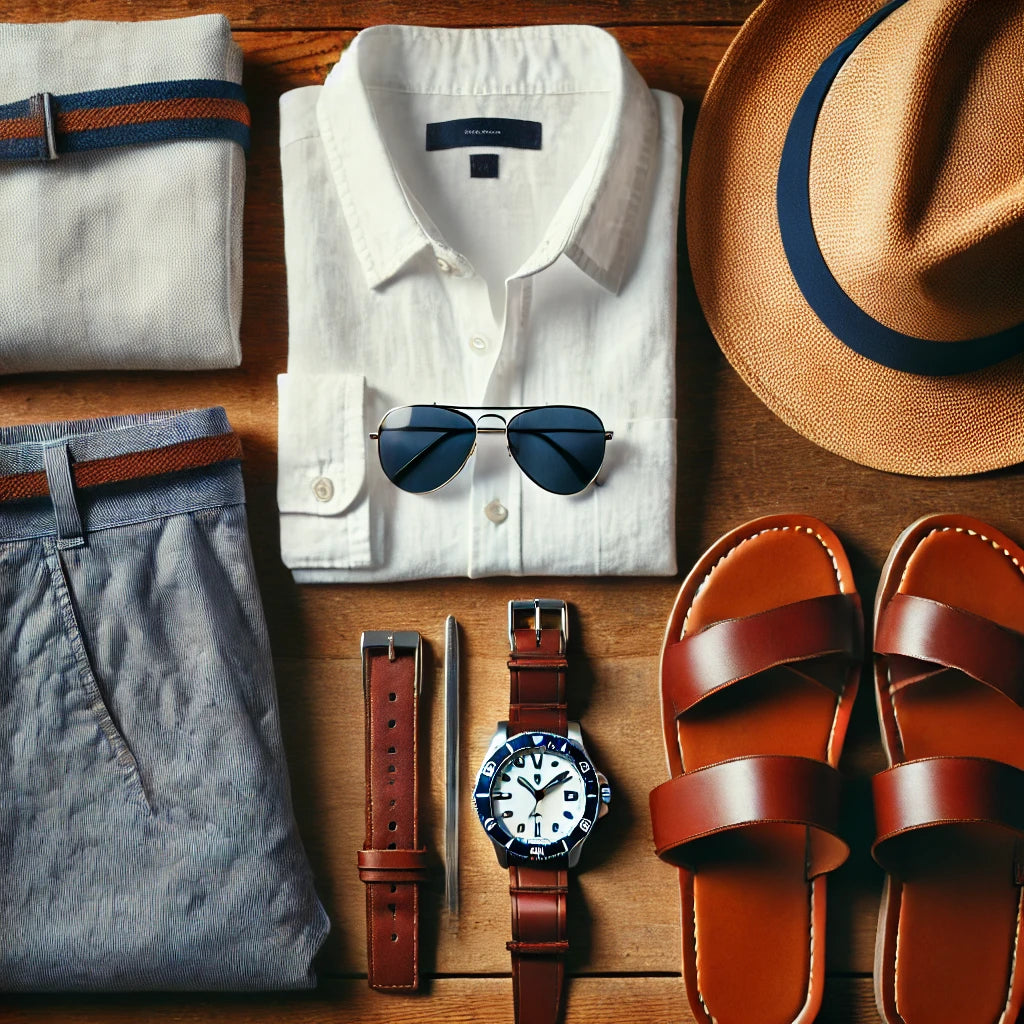 - Accessories: Panama hat, minimalist leather bracelet