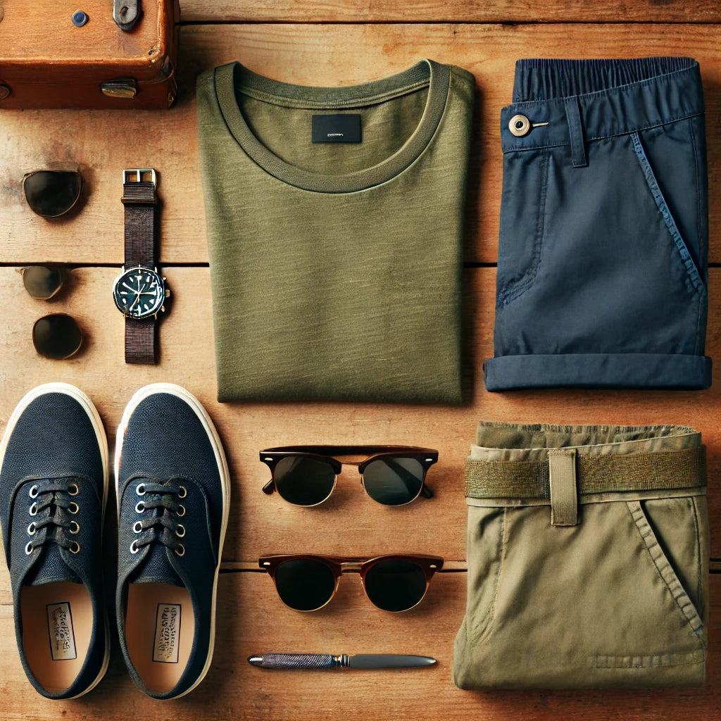 - Bottom: Khaki cargo shorts