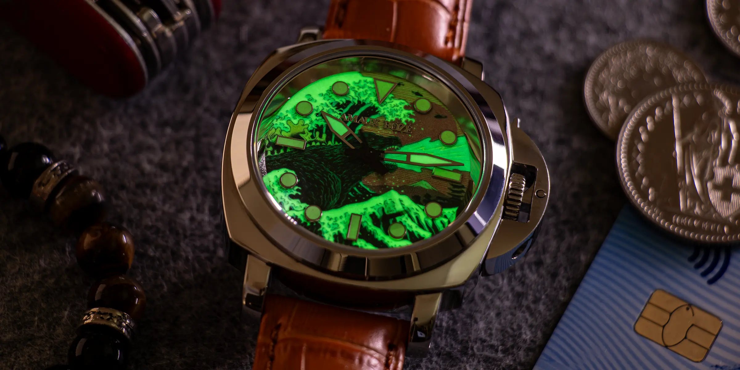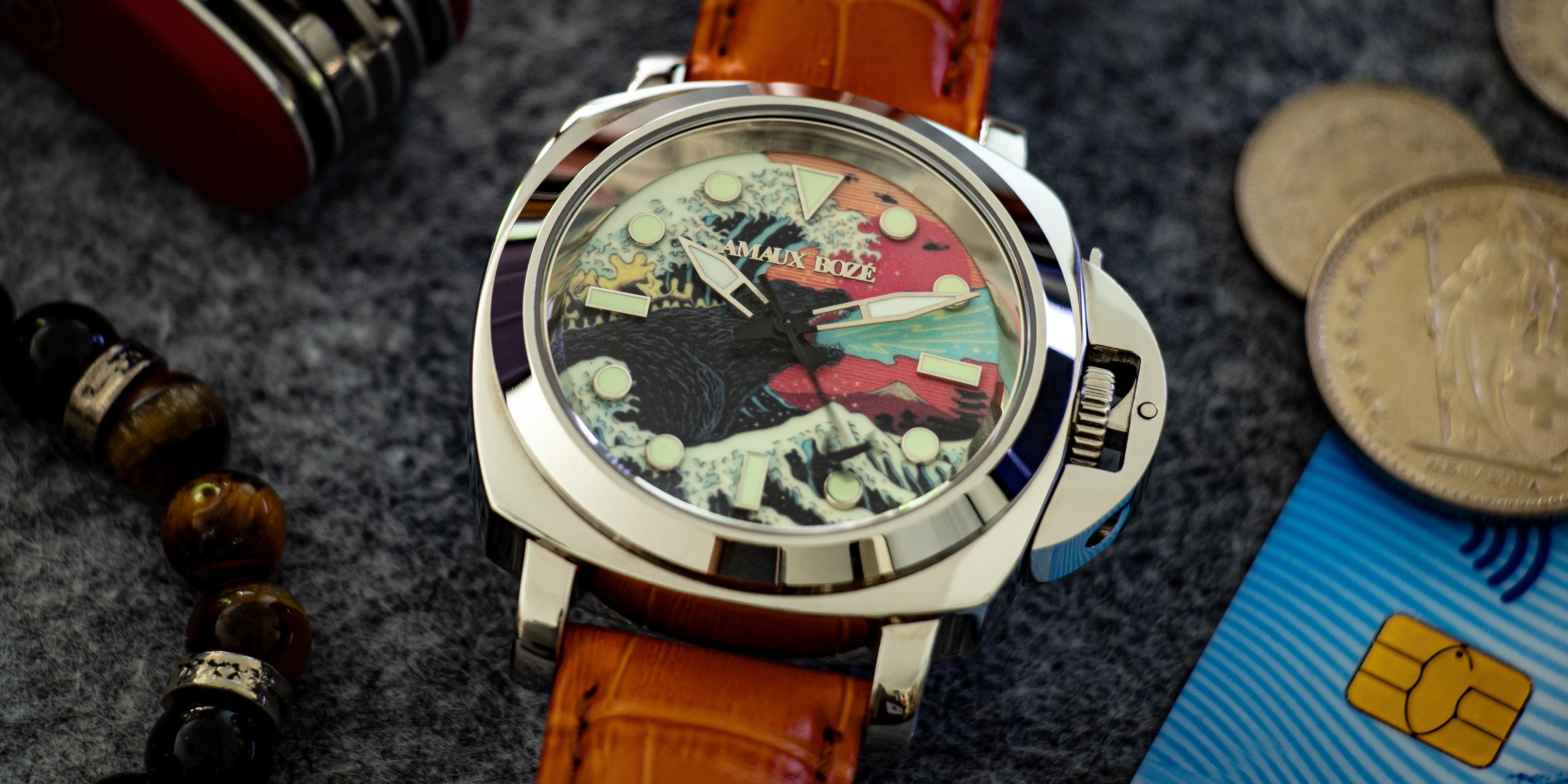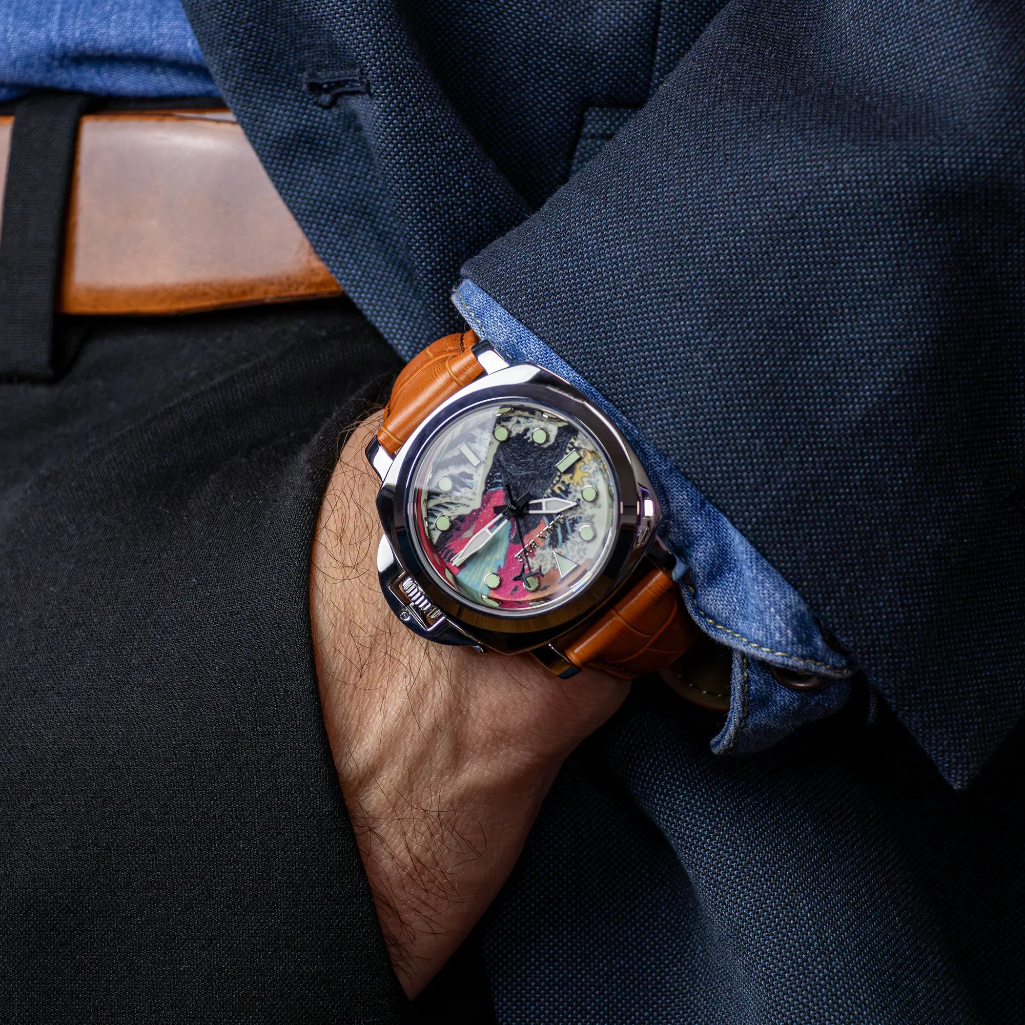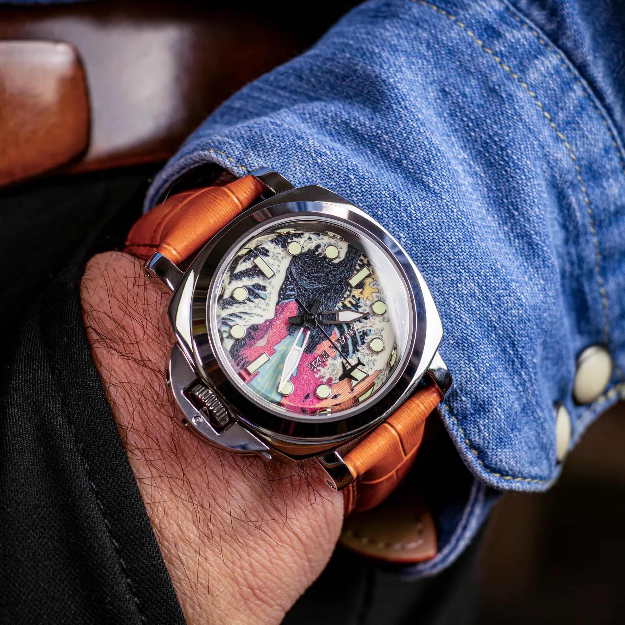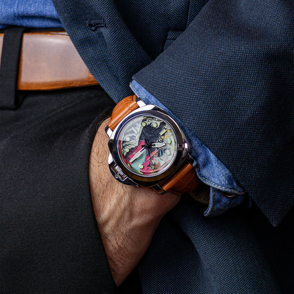 This dial doesn’t just tell time—it tells a story. Featuring The Great Wave of Kanagawa, a mythical sea monster, and a playful airplane-shaped second hand, it’s a vibrant tribute to imagination, adventure, and personal style. By day, it’s an eye-catching conversation piece. By night, the full lume dial transforms into a glowing work of art—ready for anything.